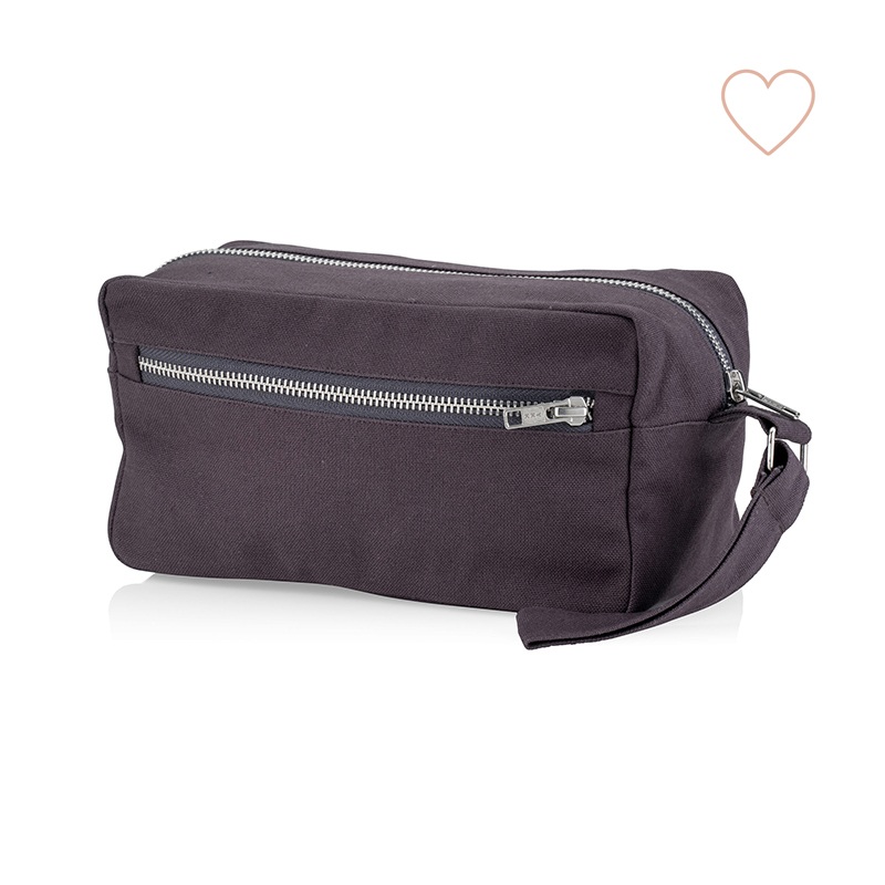 De stoere antracietkleurige toilettas is gemaakt van biologisch (GOTS gecertificeerd) canvas.