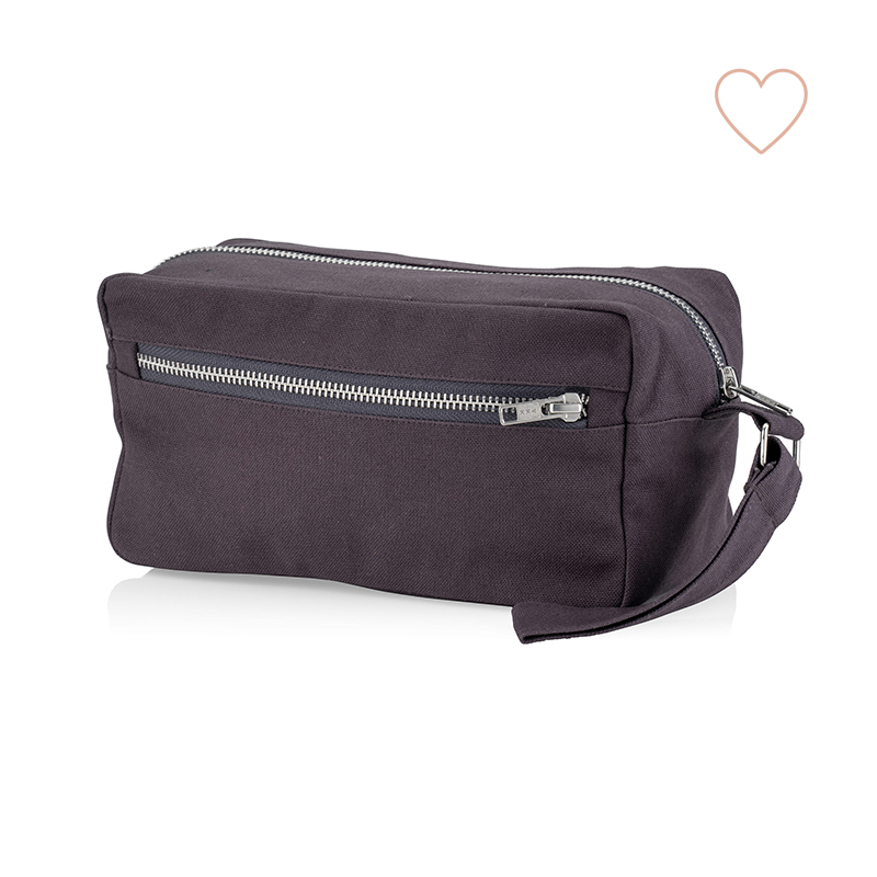 Deze mooie en stoere toilettas van biokatoenen canvas (GOTS gecertificeerd) is een stoer en praktisch item voor elke man. Maar ook voor een stoere vrouw is hij erg mooi. Twee vakken en twee ritsen om een hoop spulletjes in op te bergen. De toilettas heeft een mooi handvat, een stevige lus waarmee je ‘m kunt oppakken en ophangen.