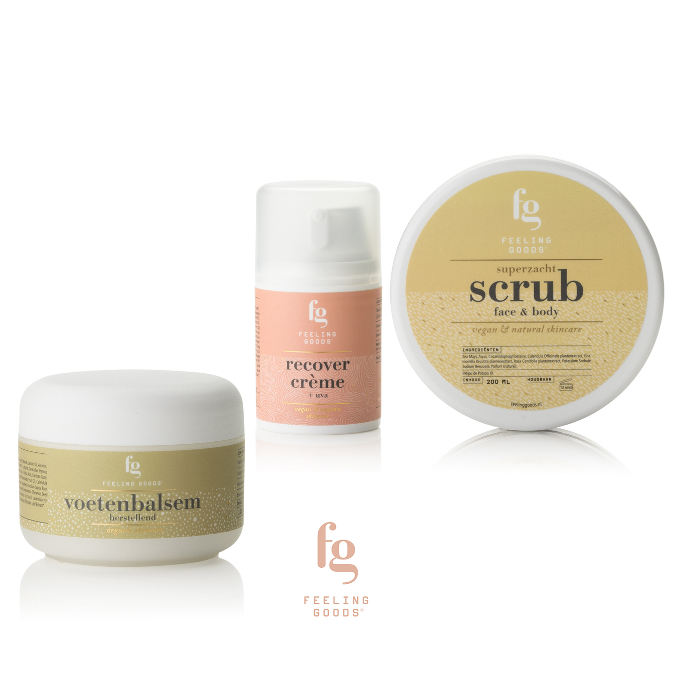Verzorgingsset recovercrème, voetenbalsem en scrub face & body